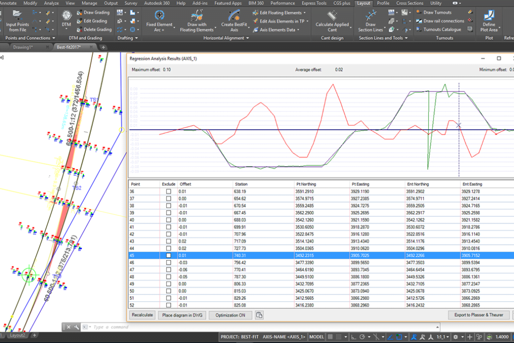 Ferrovia zapewnia zaawansowaną i wszechstronną technologię do analizy wyrównania i regresji profilu oraz opcji optymalizacji geometrii. Na podstawie różnych danych wejściowych oraz wielu edytowalnych parametrów, linii trasowania z odpowiednimi krzywymi przejściowymi są generowane automatycznie, dając użytkownikom możliwość tworzenia projektów na każdą skale. Pojedyncze elementy regresji są także wspierane.